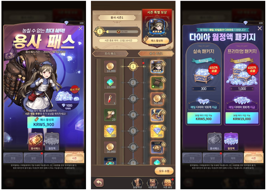 용사 패스 5900원과 월정액 5900원과 19000원 통상적인 정액요금인데 초반이라 아직 불편함을 못 느끼겠다. 스테이지 3~4정도 가면 벽이 느껴지려나....하다보니 1시간을 훌쩍 지나가는데 시간 킬링용으로 좋다고 생각한다. 원래 퍼즐게임을 좋아하지는 않지만 나름대로 소소한 재미가 있고...케릭 일러가 흠흠...=ㅅ=;; 용사 패스 보상으로 주는 루루는 힐에다 지속힐까지 주는 것 같아서 1티어쯤 되지 않을까 싶다. 지금 쓰는 4성 불속성 힐러는 1회 회복에 상태이상 회복인데...