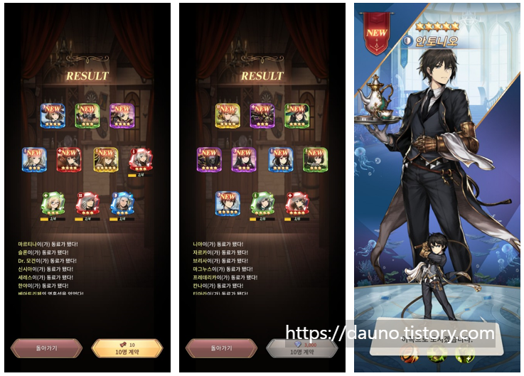 첫 10뽑은 환야(5성)과 4성 3마리, 두번째 10뽑은 안토니오(5성)과 4성 6마리...세번째는 4성만 4마리 나왔음. 5성 확률이 나쁘지는 않은 것 같고...또 나오는 케릭은 조각으로 바뀜.