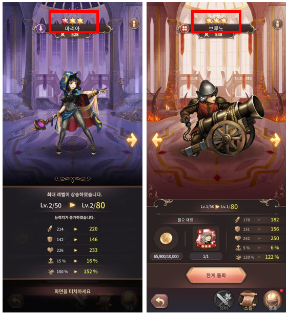 한계 돌파는 똑같은 케릭을 뽑으면 가능한데 이미 소유한 케릭터를 뽑으면 조각으로 받고...1개의 조각으로 1한계돌파가 가능하다. 다음 한계 돌파도 조각이 1개 더 있으면 가능한데 3성의 경우 마지막 돌파 때 조각 2개가 더 필요하다. 별을 모두 채우면 4성으로 승성이 가능한지는 아직 테스트 못했다. (3성 한계돌파를 끝내도 4성 승급은 안된다. 확인완료)